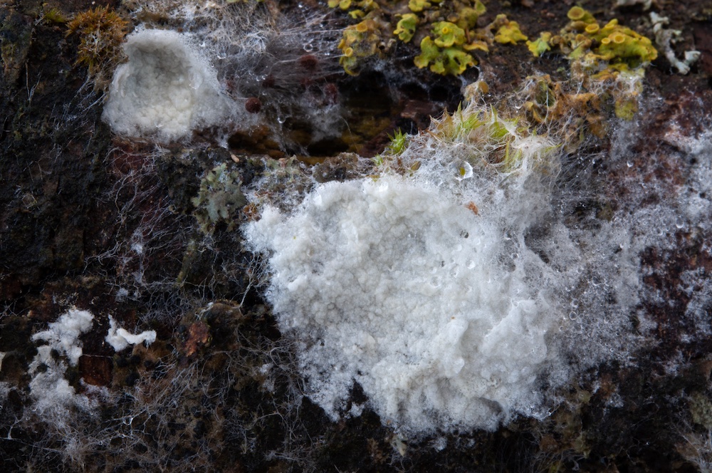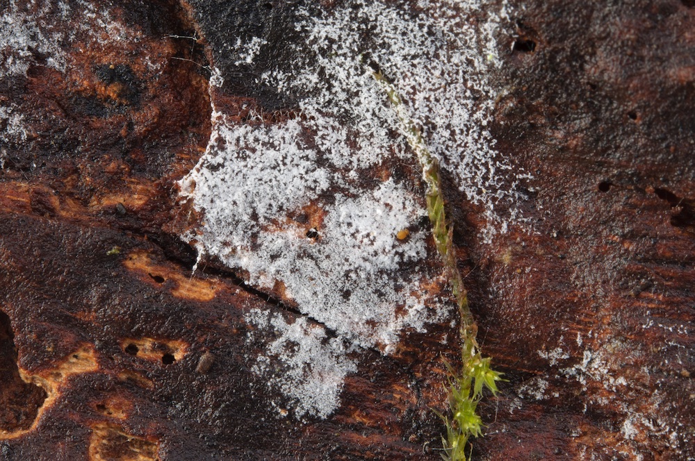 Holwaya mucida: Liegender Tilia-Stamm. Interessanterweise wurde der befallene Tilia-Stamm von zwei dickeren Salix-Stämmen umgerissen, auf welchen die Holwaya ebenfalls wuchs. Mir war neu, dass sie auch auf anderen Substraten als Tilia vorkommen kann – von Irmgard und Hermann gibt es bereits einen Nachweis auf Quercus in der Myk. DB. .