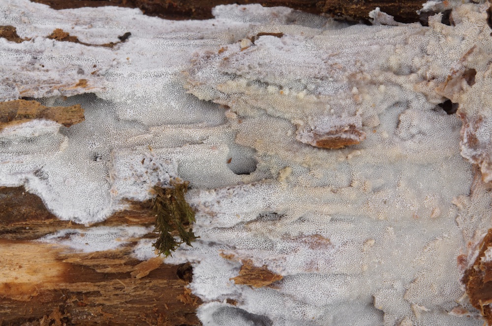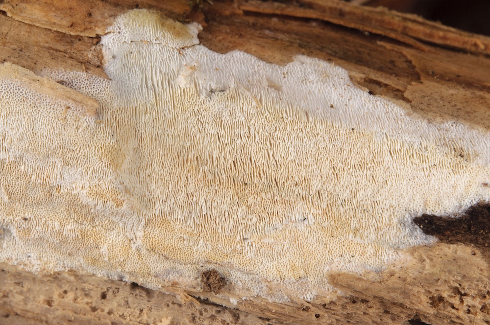 Protomerulius pertusus: Laubholz-Stamm, Unterseite. Ebenfalls mit Spirin et al. bestimmt, wichtige Merkmale: Helle, flockige Fruchtkörper und schlanke Zystiden.