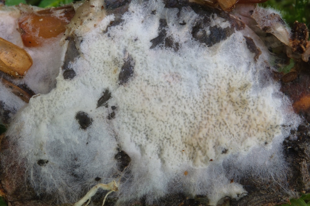 Byssomerulius hirtellus: Unterseite eines liegenden Fagus-Astes.
