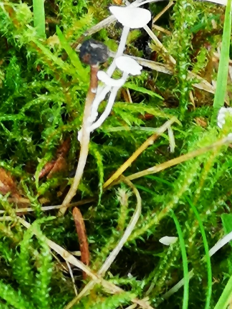 Der parasitische Pilz scheint eine Hemimycena zu sein.