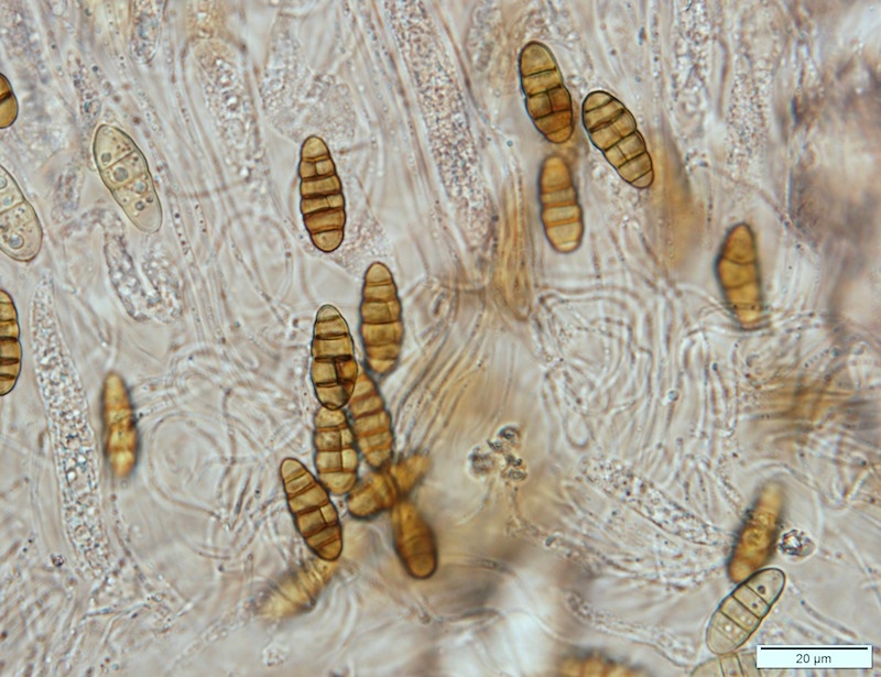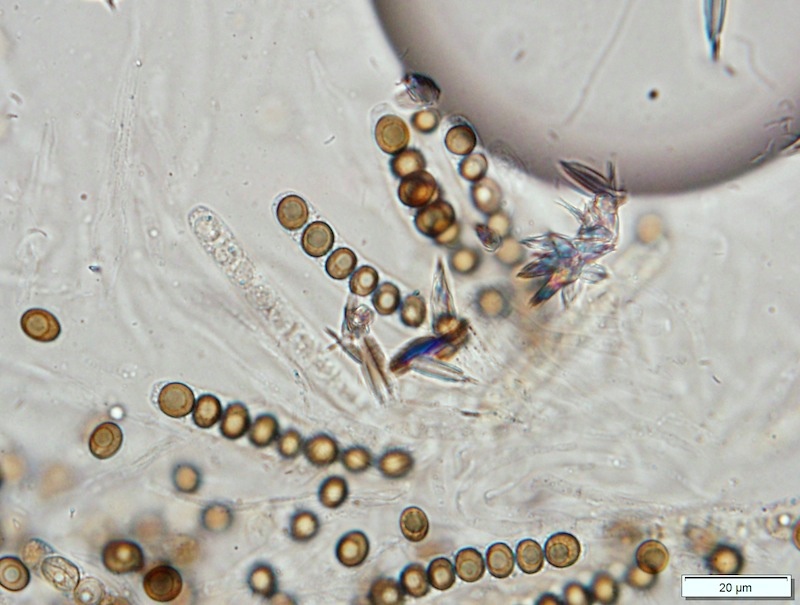 Typisch für die Gattung Coniochaeta sind die schwarzen, kugeligen, oberflächlichen, behaarten Fruchtkörper (natürlich gibt es Ausnahmen mit anderen Merkmalen) in Kombination mit braunen Sporen + Keimspalten. Diese Kollektion nenne ich mal Coniochaeta cf. velutina, da mir die Sporen (nur ca. 7–8 µm lang) etwas zu rundlich erscheinen.