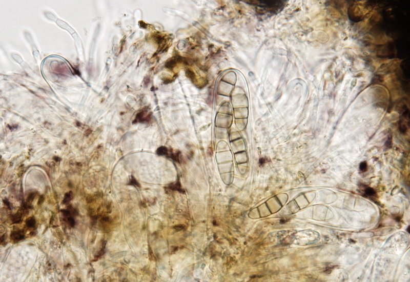 Die Sporen sind reif im Mikroskop gut durch ihre Zweifärbigkeit erkennbar (die mittleren Zellen dunkler), unreif wird es schon schwieriger. Und man muss jede dieser Aufsammlungen mikroskopieren, denn es gibt ähnliche Arten, die aber andere Mikromerkmale haben, wie z.B. Hysterographium fraxini mit mauerförmigen Sporen.