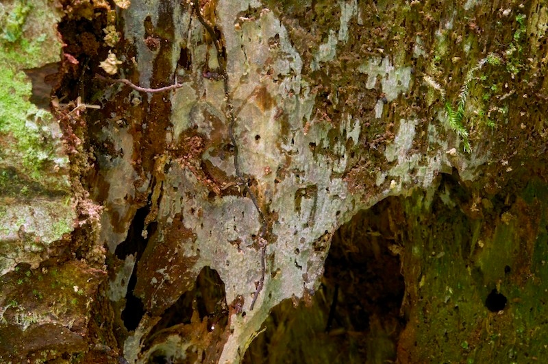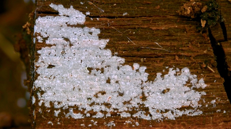 Und schließlich die wohl unscheinbarste dieser Arten, Lobulicium occultum. Sie wächst nur (soweit ich weiß bzw. das bisher selber beobachten konnte) auf der Unterseite braunfauler, stark vermorschter Nadelholzstücke, besonders in alten, liegenden Stämmen. Obwohl ich mehrere Standorte im Kärntner Koralmgebiet nahe der Grenze zur Steiermark kenne (ein Foto habe ich hier bereits gezeigt), ist dies der erste mir bekannte in der Steiermark.