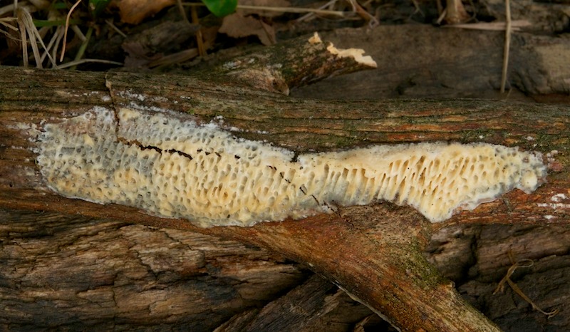 Resupinatus poriaeformis auf der Unterseite eines dicken, morschen, liegenden Fagus-Astes: