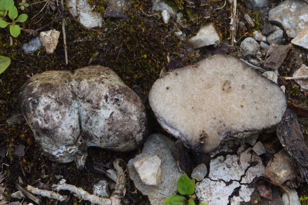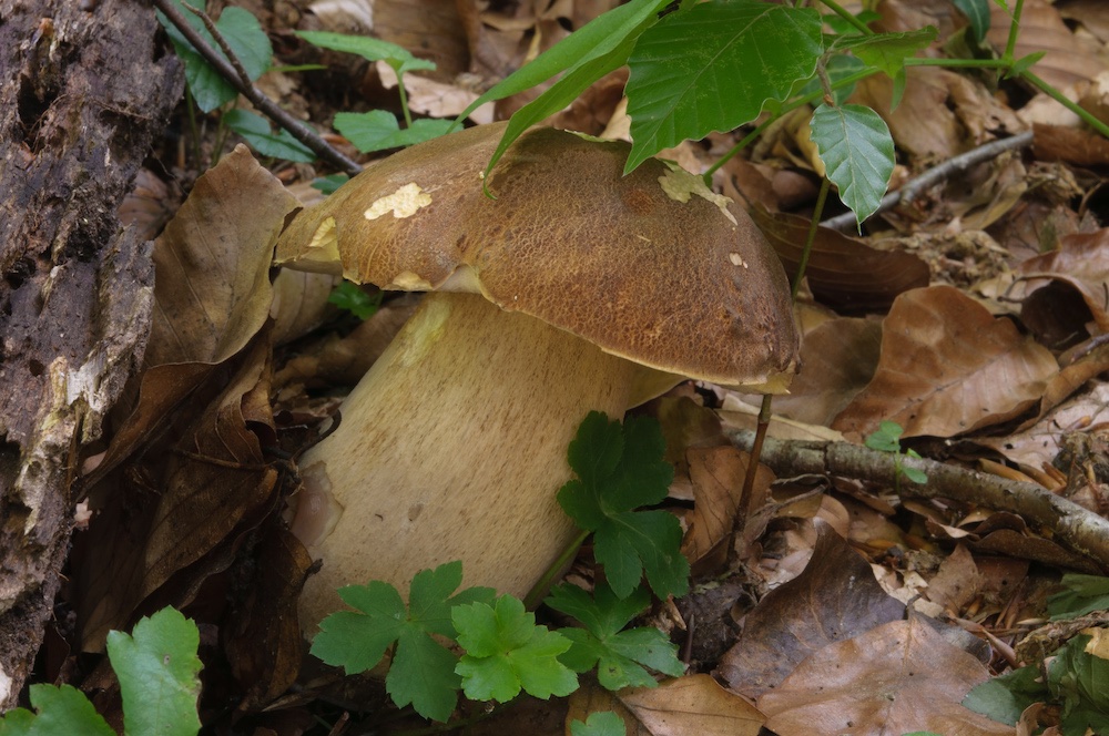 Xerocomellus porosporus/truncatus: Ein Filzröhrling mit abgestutzten Sporen unter älteren Buchen. Mit Wolfgangs Schlüssel komme ich zu diesen beiden Arten – ob die Sporen längsgerippt sind, kann ich im LM nicht sicher erkennen, ich werde aber versuchen, das im REM überprüfen zu lassen. Für X. porosporus irritiert mich das blauende Fleisch etwas, X. truncatus kenne ich nicht. .