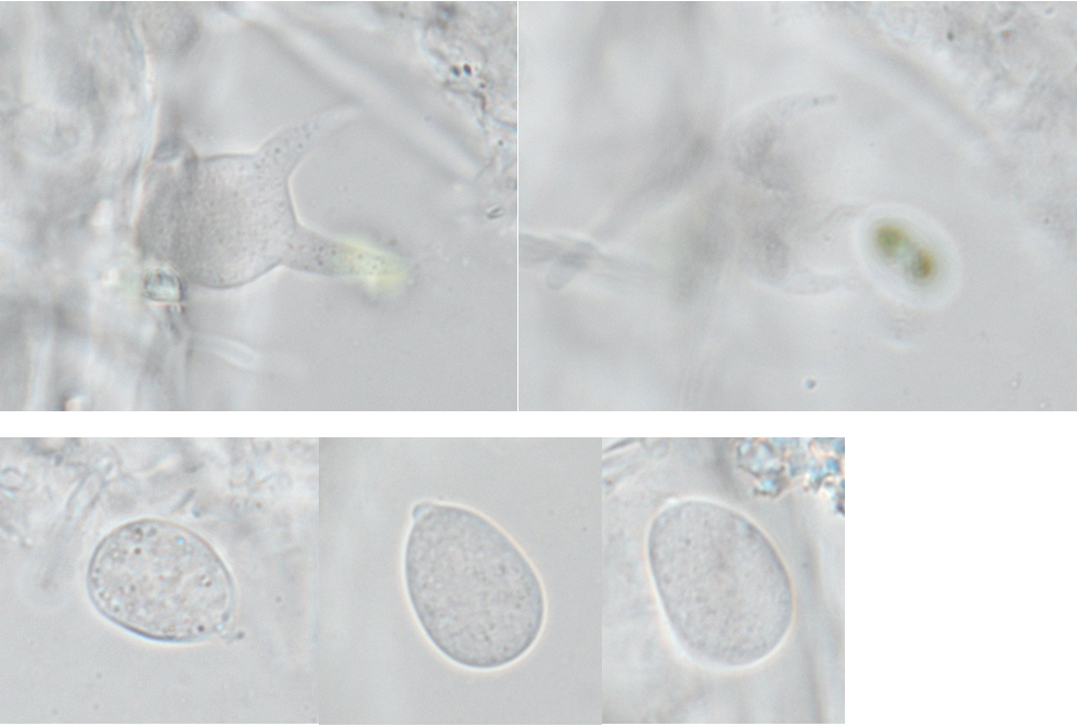 Laetisaria endoxylon (= Corticium e.): Liegende Äste von Carpinus betulus, auch auf Fagus beobachtet. Auf den Mikrofotos sieht man eine viersporige Basidie und ein paar Sporen. Möglicherweise neu für Österreich, aber offensichtlich nicht selten.