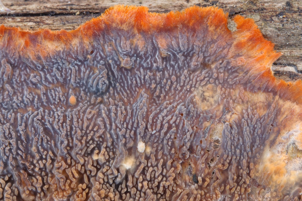 Phlebia radiata: Liegender Carpinus-Ast. .