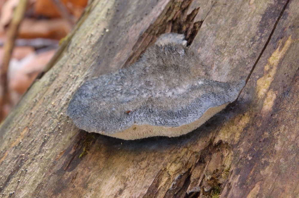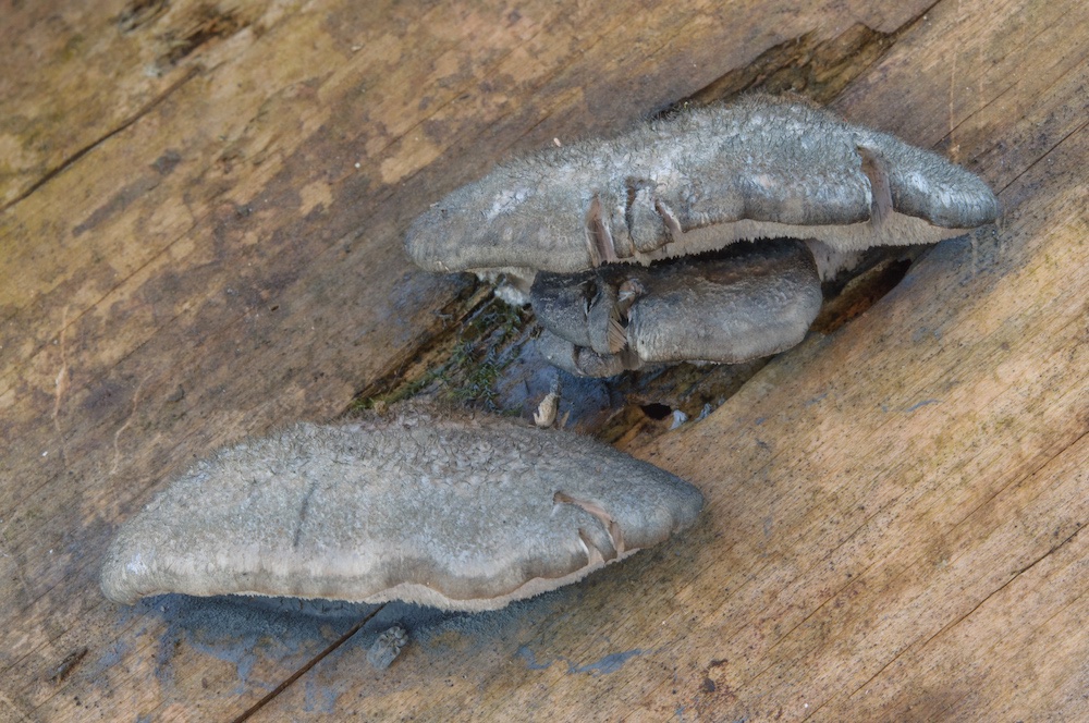 Postia caesia s. str.: Liegender Abies-Stamm. Mit deutlich blau gefärbtem Sporenpulver. .
