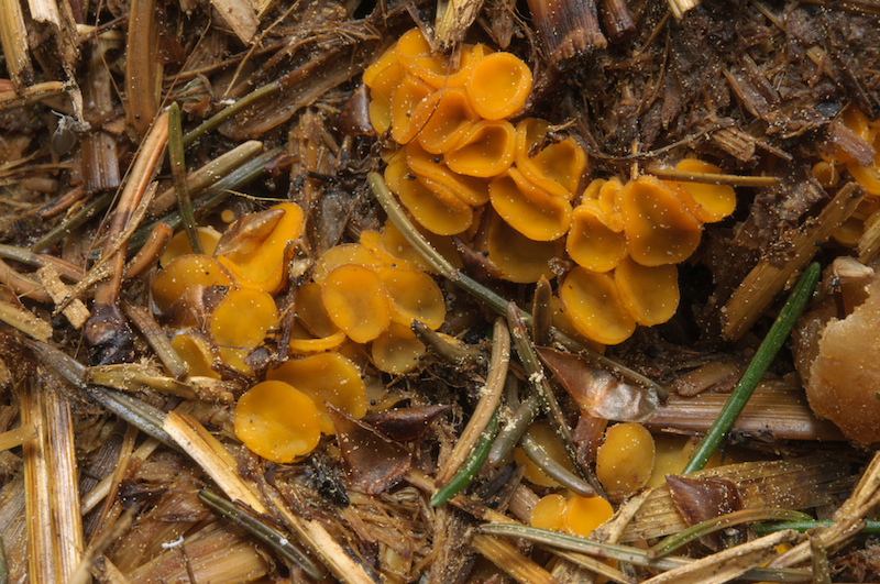 Nicht auf Mist wuchs hingegen ein leuchtend gelber Becherling, bei dem im Feld schon die Vermutung auf eine Sowerbyella nahe lag. Das Mikroskop hat es bestätigt – für mich der Fund des Tages:
