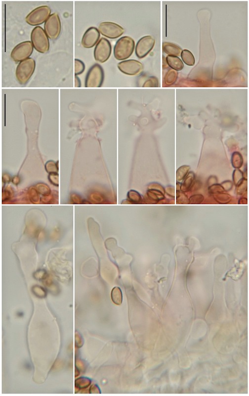 Von der Originalbeschreibung von Psilocybe xeroderma (Huijsman 1961) weichen meine Aufsammlungen aber m. E. durch die schmäleren (kaum abgeflachten) Sporen und die längeren sowie anders geformten Cheilozystiden ab.