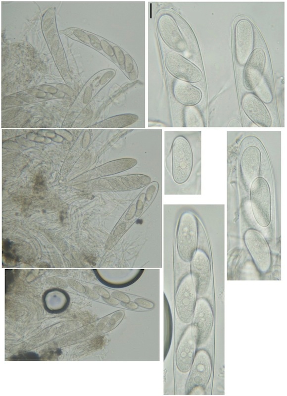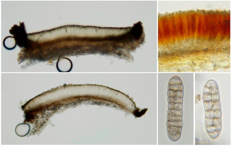 Besonders spannend finde ich die folgende Art, die wir im vergangenen Jahr neu beschrieben haben (siehe Fernández-Brime et al. 2017). Sie heißt Cryptodiscus muriformis und bildet, wie das ja typisch ist für die lignicolen Arten dieser Gattung, im Holz eingesenkte Fruchtkörper. Aufgrund ihrer wenig auffälligen Färbung ist sie daher nicht leicht zu entdecken. Dafür kann man sie im Mikroskop anhand ihrer muriformen Ascosporen umso leichter bestimmen, denn sie ist die derzeit einzige bekannte Cryptodiscus-Art mit diesem Merkmal.