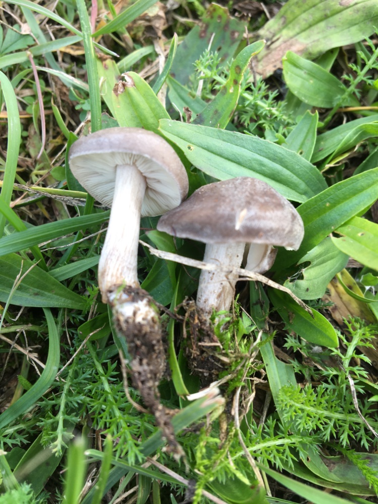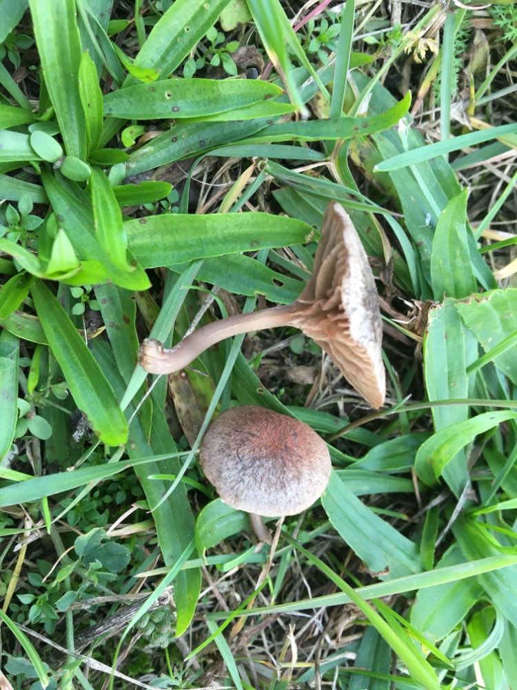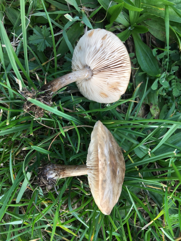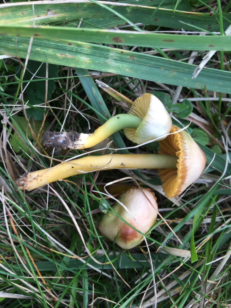 Ich tue mir schwer mit der Unterscheidung der Wiesen-Lepisten. Bei deiner Kollektion würde ich aufgrund der zahlreichen Wassertropfen am Hut auch L. panaeolus in Erwägung ziehen. Der nabelingsartige Pilz sieht interessant aus, evtl. könnte das ein Rötling sein (ich meine rosa Sporenpulver zu erkennen). Klein und gelb: Vielleicht Stropharia coronilla mit Befall. Beim Letzten würde ich auch Agrocybe vermuten, z. B. A. vervacti oder A. pediades.