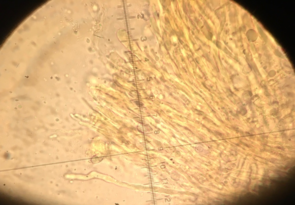 da würde ich als erstes bei Gloiothele lactescens schauen. Typische Merkmale wären lange, schlanke Gloeozystiden, schwach amyloide Sporen und schnallenlose Hyphen; der Habitus und die Ökologie würden jedenfalls gut übereinstimmen, und auch, was man so auf den Mikrofotos sieht.