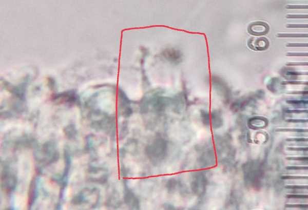 Beim Mikroskopieren würde ich empfehlen, möglichst kleine Stücke zu entnehmen. Anfärben mit Kongorot hilft, auch mit KOH lassen sich die Strukturen oft besser beobachten als in Wasser. Manchmal muss man durchaus auch etwas mehr Kraft beim Quetschen anwenden, um die Basidienbasen freizulegen.