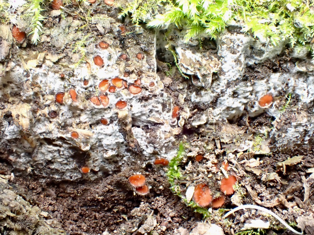Die porlingsartigen Strukturen bildeten sich nur tw. aus. An der Oberseite war nur ein weisser Filz vorhanden, der mikroskopisch mit den porlingsartigen Strukturen ident war. Dahinter am liegenden morschen Stamm fand ich rotbraue Strukturen, die mich an einen alten Schleimpilz oder an Botryobasidium aureum erinnerten. Davon gibt es aber (leider) keinen Beleg. An der Oberseite wuchs Scutellinia crinita auf dem Porling.