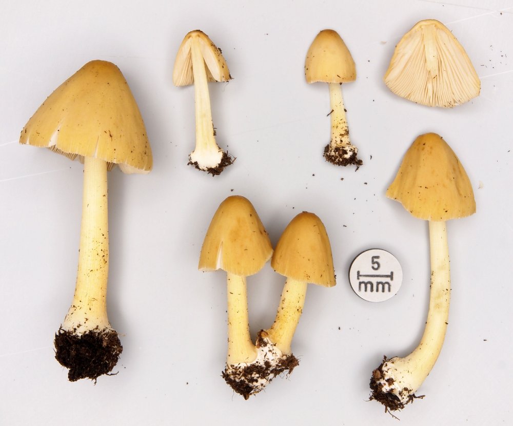 Conocybe hornana - bemerkenswert sind die Volva an der Basis und die prächtigen freudig gefärbten Frkp.
