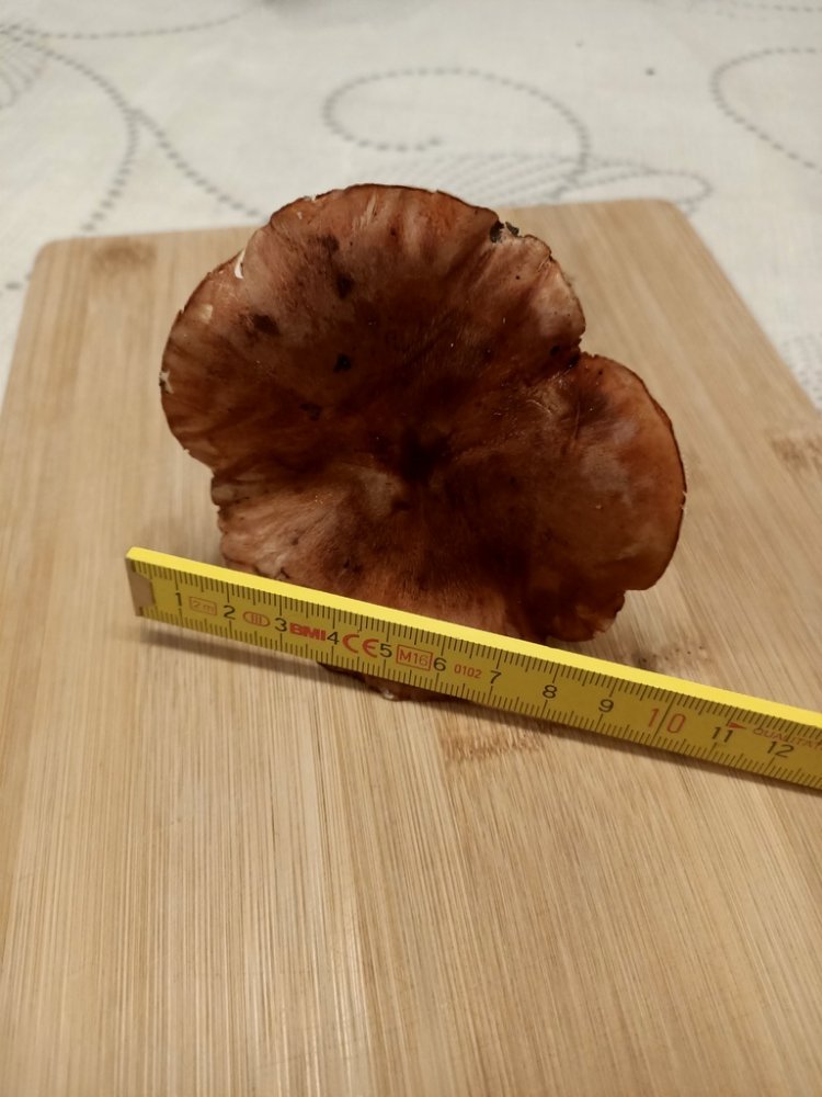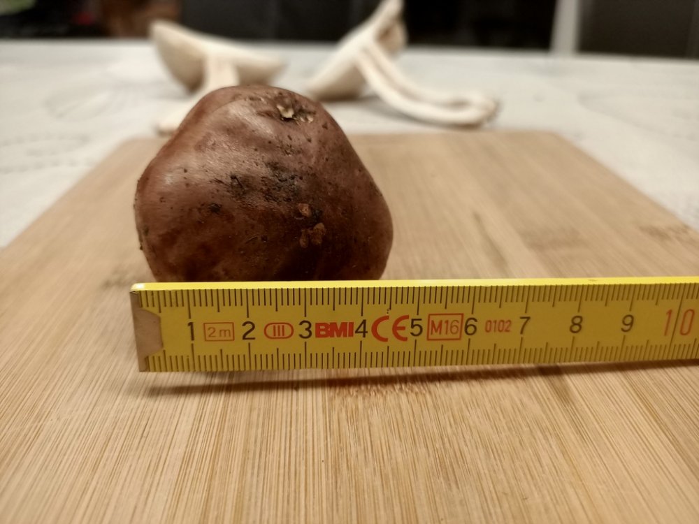 Nach ein paar Tagen beobachtet: Die Schnittfläche des Stieles, dort wo es nicht "wattig" war hat sich über ein paar Tage ganz leicht bräunlich verfärbt, das wattige blieb reinweiß. Hutfleisch kaum angefärbt, fast vollständig weiß geblieben, Lamellen an den Rändern auch leicht gebräunt.