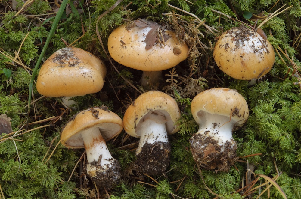 Wichtige Merkmale zusammengefasst: KOH (20 %) am Hut schwach bräunlich, auf der Knolle und im Fleisch negativ (nur in der Basis schwach gelblich); Sp < 9,5 µm lang, mandelförmig; Fleisch im Hut weiß, in der Stielmitte violettgrau, in der Basis gelblich; Geruch fehlend. Ich kann mich kaum zwischen C. caesiocanescens und C. aurantiobasalis entscheiden, auch C. foetens scheint Ähnlichkeiten zu haben, wenn ich hiermit vergleiche: http://www.interhias.de/schwammerlseite ... html#ank32.