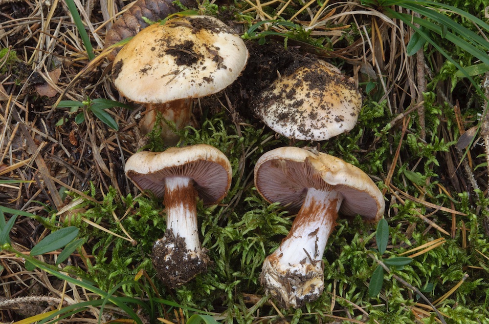 Mit Funga Nordica lande ich direkt bei C. subgracilis. Da die Hüte daheim schwach nachgedunkelt sind, habe ich auch die Alternative mit intensiver gefärbten Hüten verfolgt und lande damit bei C. barbaricus. Dazu würde auch die Sporengröße (– 13 µm) besser passen. Weitere Merkmale: Hutmitte mit kleinen, bräunlichen Velumflocken; Lamellen violett; KOH auf Hutrand und Knolle rosa/pink, im Fleisch negativ; Fleisch in der Stielmitte etwas violett, sonst creme; Geruch fehlend.