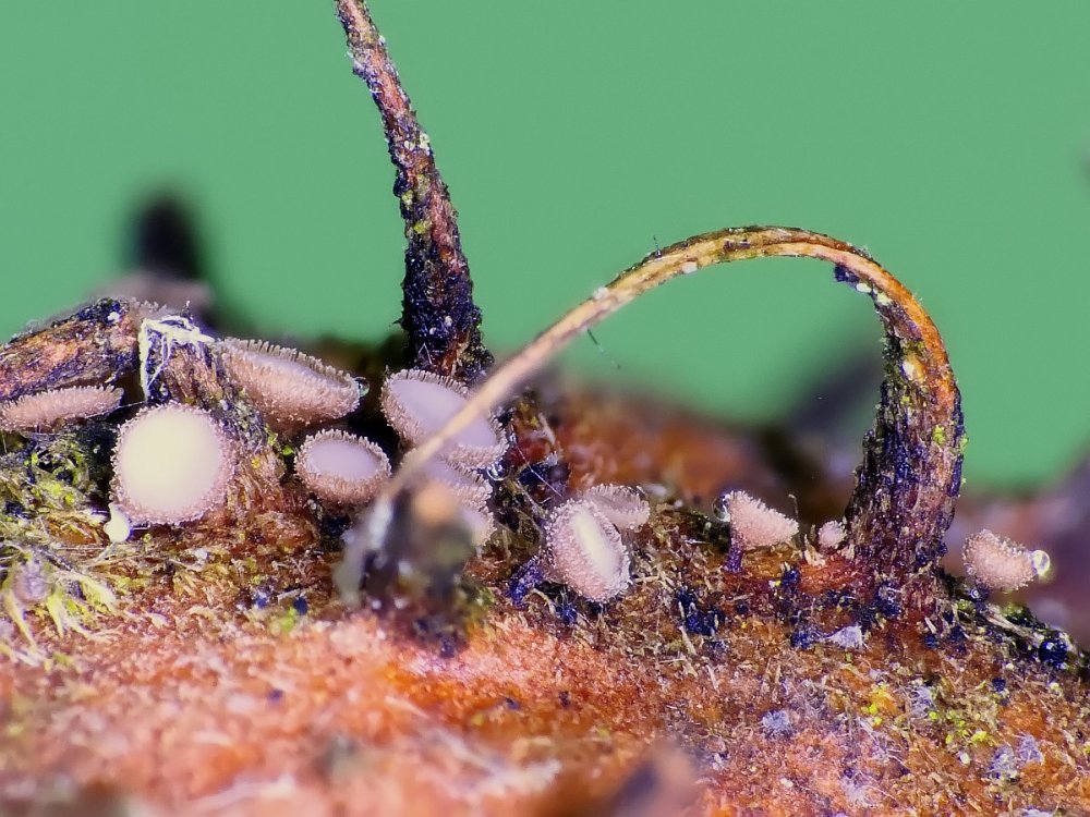 Ich habe auf Bucheckern winzige Becherlinge gefunden, wo ich bei einer Bestimmung scheitere.