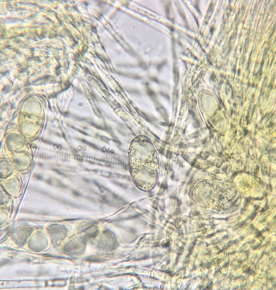 Die Sporen messen 20,5-23 x 10,5-12,5 und haben zwei große Öltropfen.