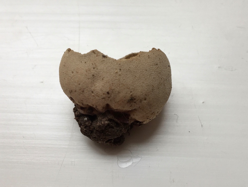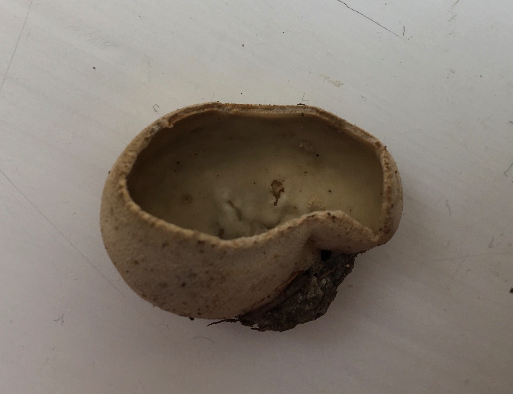 Der Fruchtkörper ist so gut wie ungestielt und hat einen Durchmesser von etwa 3 cm.