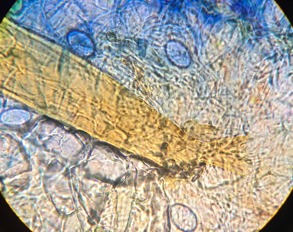 bei den Scutellinien halte ich mich immer noch gern an die Rasterbilder von Schumacher. Tendenziell hat S. crinita die "runderen" Sporen, am Ende rascher abgeflacht, und S. scutellata die "konischer zuspitzenden". Die Sporen würde ich den runderen zuordnen. Das Ornament kann man genauer sehen, wenn man die Blende weiter aufmacht und dann auf die Sporenoberfläche scharf stellt, dann ist zwar der Umriss unscharf, aber man sieht die Ornamentierung besser. Leider scheinen erst wenige wirklich reif zu sein, da viele noch in den Asci drinnen sind.