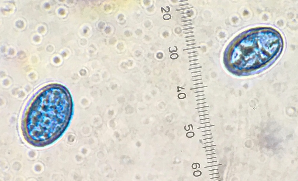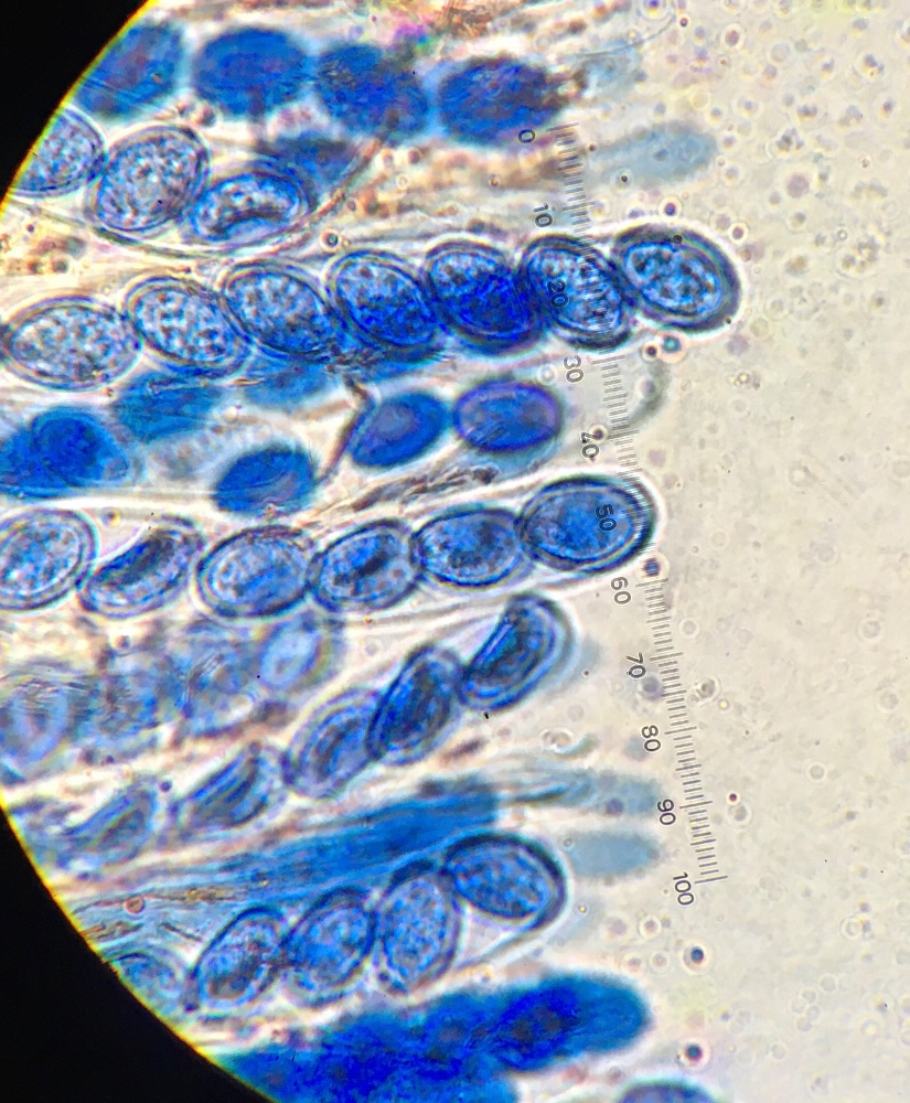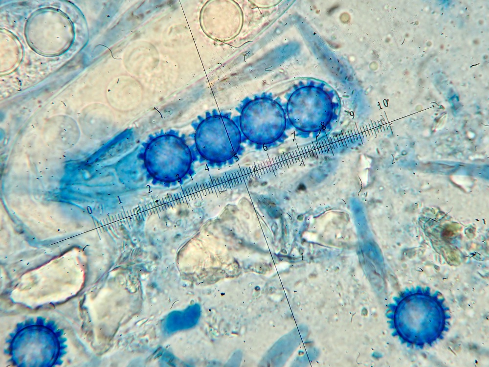 Die Sporen sind ellipsoid und messen 17 x 10-12, die Enden sind abgerundet. Für mich ist das Ornament schwer beurteilbar, ich würde sagen, es sind niedrige Grate und Warzen. Ich habe einige Fotos gemacht, um eine Beurteilung zu ermöglichen. Der Sporenquotient beträgt 1,57.