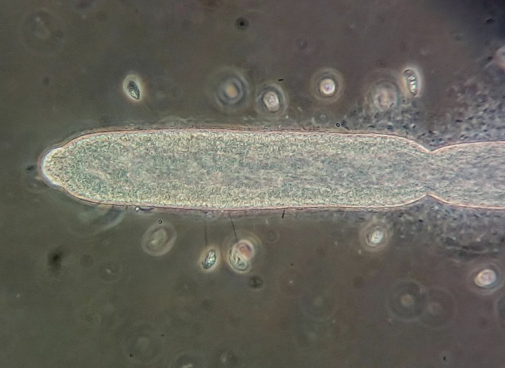 Planosporangien (nach ESSER), von winzigen Wimpertierchen besiedelt; und ein Oogonium. Hyphen im Dunkelfeld von Bakterien umgeben.