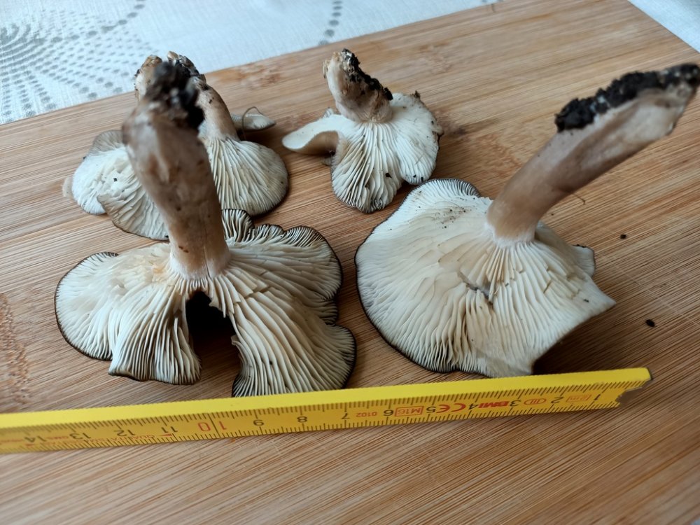- Dunkelbrauner Hut, matt. Zum Rand hin deutlich heller werdend. Leicht trichterförmig, alle, auch kleinere Kappen waren stark gewellt. Sehr brüchig!