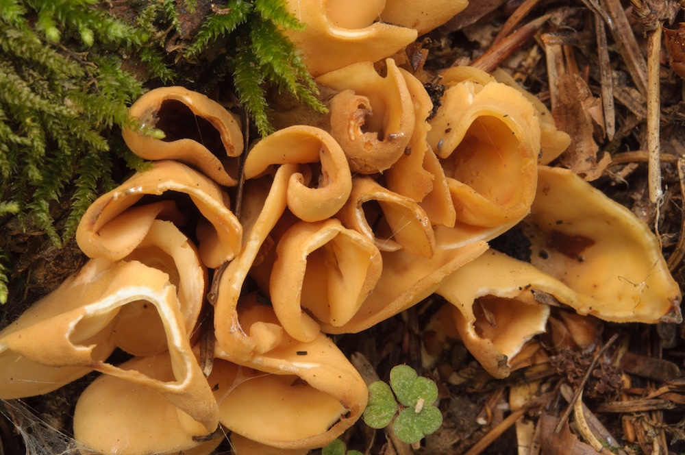 Scutellinia setosa: Morscher Baumstamm. Ein seltener Schildborstling mit eher blassen bis gelblichen Apothecien und im Lichtmikroskop glatten Sporen.