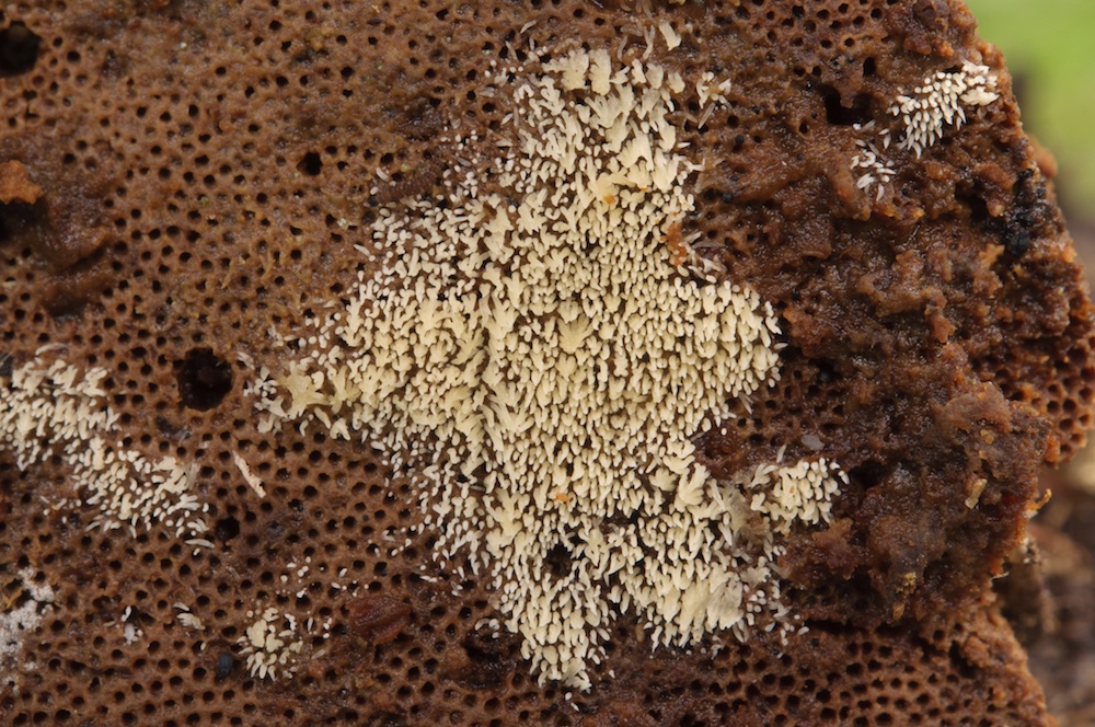 Aporpium canescens: Ein Heterobasidiomycet mit Poren! Allein aus diesem Grund schon ein besonders interessanter Pilz. Liegender Fagus-Stamm.