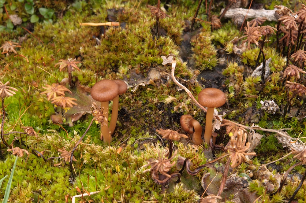 Omphalina cf. pyxidata: Auf bemoosten Brandstellen, scheinbar immer auf Marchantia wachsend. Leider kann es keine Loreleia sein, da die Fruchtkörper Schnallen besitzen.