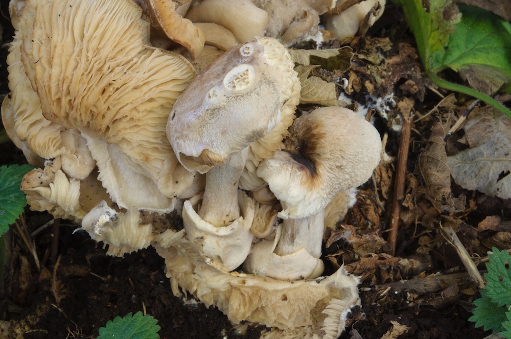 Lyophyllum sp.: Komischer Büschelrasling mit grauen Lamellen. Reichliches Wachstum an Waldrand unter Fagus, Picea etc. über Kalk.