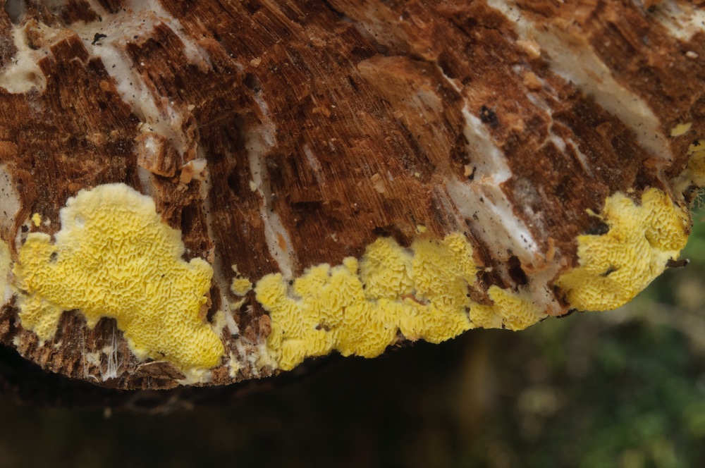Flaviporus citrinellus (= Antrodiella citrinella): Ein charakteristischer Urwaldpilz, der an von Fomitopsis pinicola befallenen Nadelholzstämmen wächst (hier Picea).