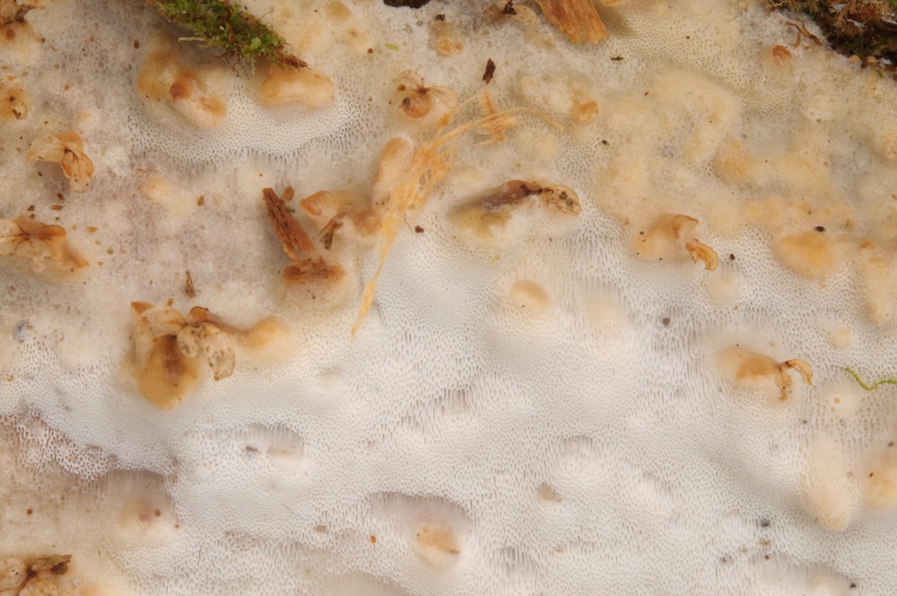 Mucronella calva s. l.: Unterseite von Fomitopsis pinicola.