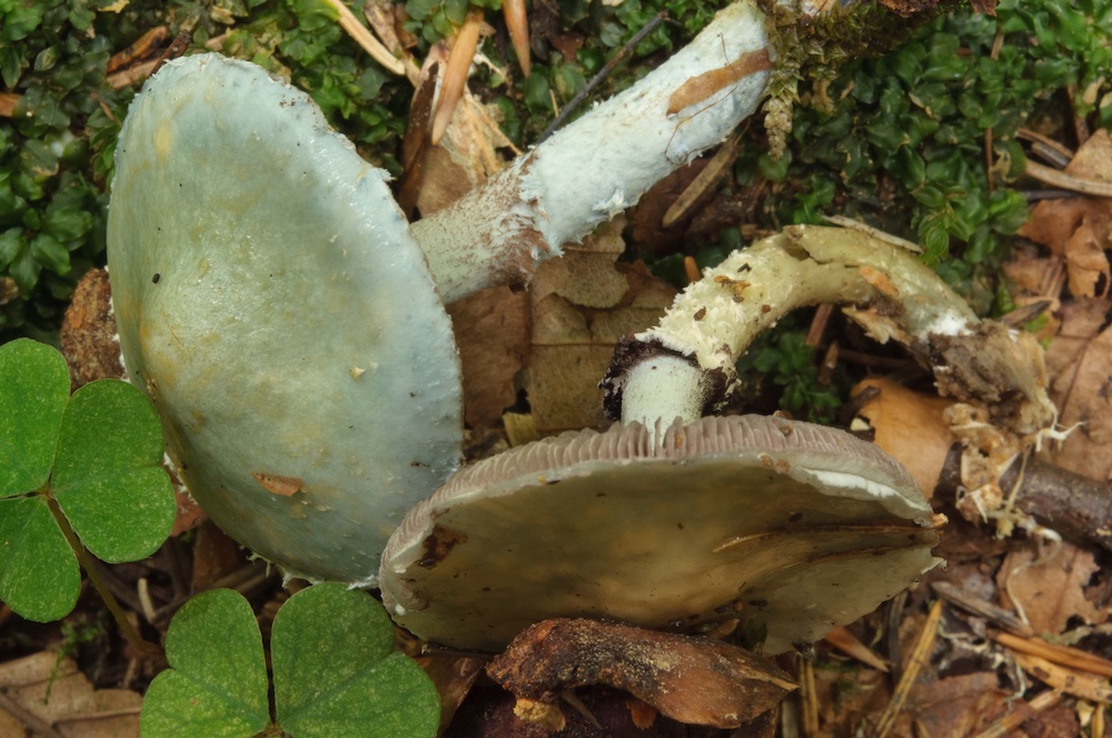 Stropharia aeruginosa (links) und Stropharia caerulea (Mitte + rechts)
