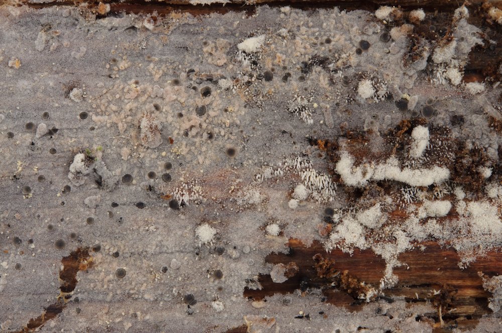 Sistotremella perpusilla: Liegender Nadelholz-Ast. Ein interessanter Pilz mit kleinen, dickwandigen Sporen.