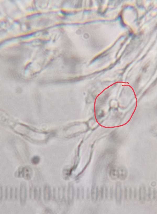 Beim Mikroskopieren würde ich empfehlen, möglichst kleine Stücke zu entnehmen. Anfärben mit Kongorot hilft, auch mit KOH lassen sich die Strukturen oft besser beobachten als in Wasser. Manchmal muss man durchaus auch etwas mehr Kraft beim Quetschen anwenden, um die Basidienbasen freizulegen.