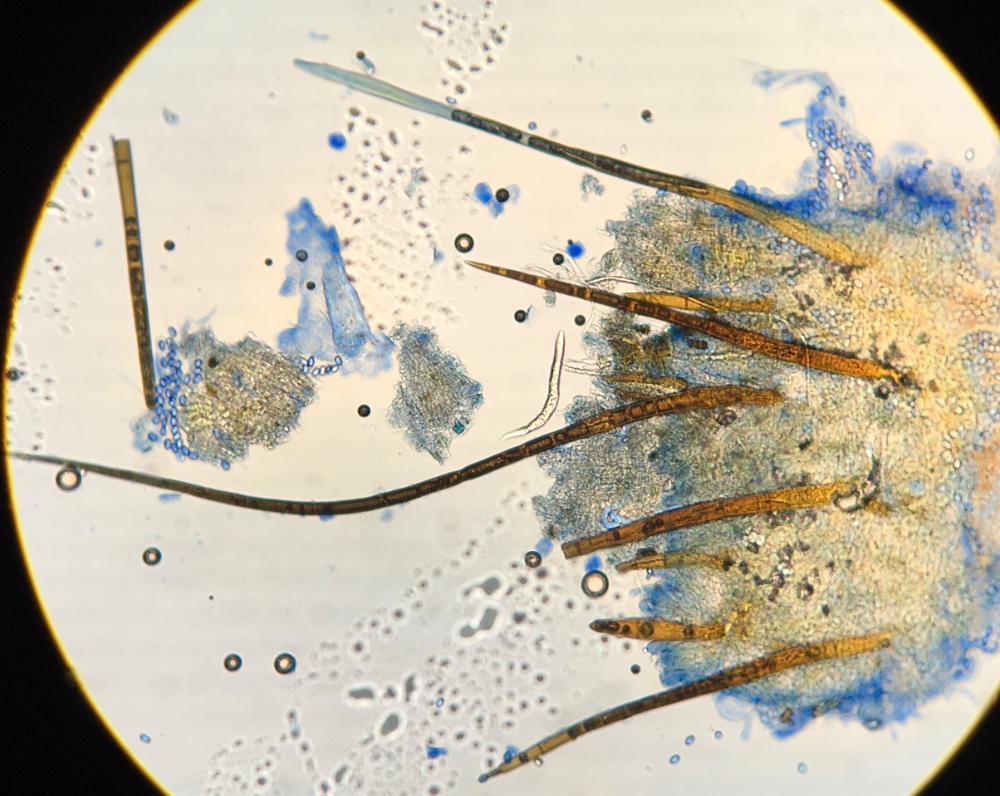 bei den Scutellinien halte ich mich immer noch gern an die Rasterbilder von Schumacher. Tendenziell hat S. crinita die "runderen" Sporen, am Ende rascher abgeflacht, und S. scutellata die "konischer zuspitzenden". Die Sporen würde ich den runderen zuordnen. Das Ornament kann man genauer sehen, wenn man die Blende weiter aufmacht und dann auf die Sporenoberfläche scharf stellt, dann ist zwar der Umriss unscharf, aber man sieht die Ornamentierung besser. Leider scheinen erst wenige wirklich reif zu sein, da viele noch in den Asci drinnen sind.