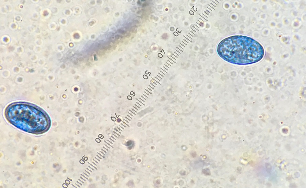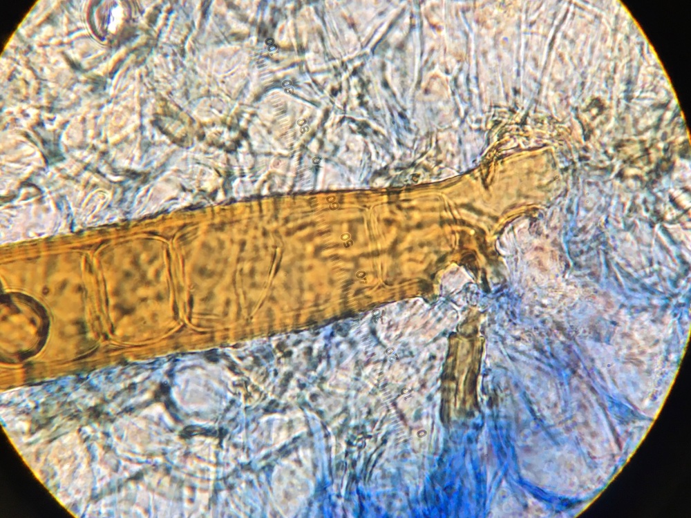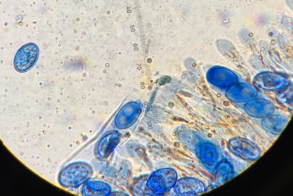 Die Sporen sind ellipsoid und messen 17 x 10-12, die Enden sind abgerundet. Für mich ist das Ornament schwer beurteilbar, ich würde sagen, es sind niedrige Grate und Warzen. Ich habe einige Fotos gemacht, um eine Beurteilung zu ermöglichen. Der Sporenquotient beträgt 1,57.