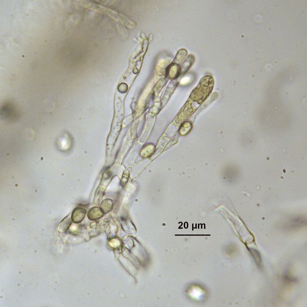 - Basidien leicht keulig, längs optisch "zweigeteilt" (ohne Septe) – oben mit lichtbrechendem Inhalt, unten ohne; reife/abgesporte Basidien 60 – 84 µm x Ø oben 8 – 9,5 / unten 5 - 6 µm, 2 bis 6-sporig – meist 5-sporig