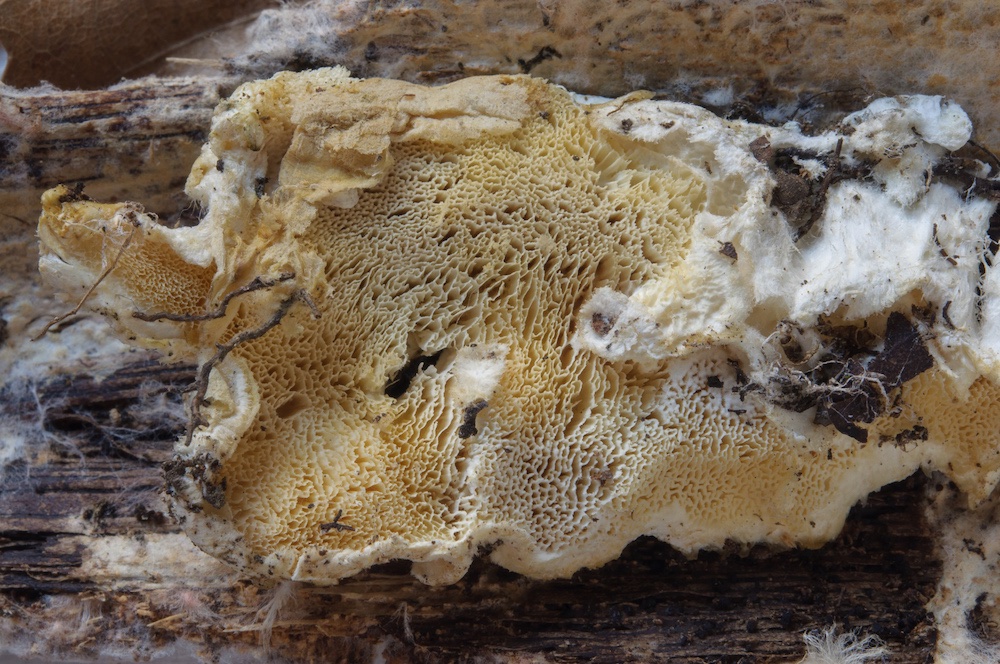 Postia ceriflua: Unterseite eines liegenden Quercus-Stammes.
