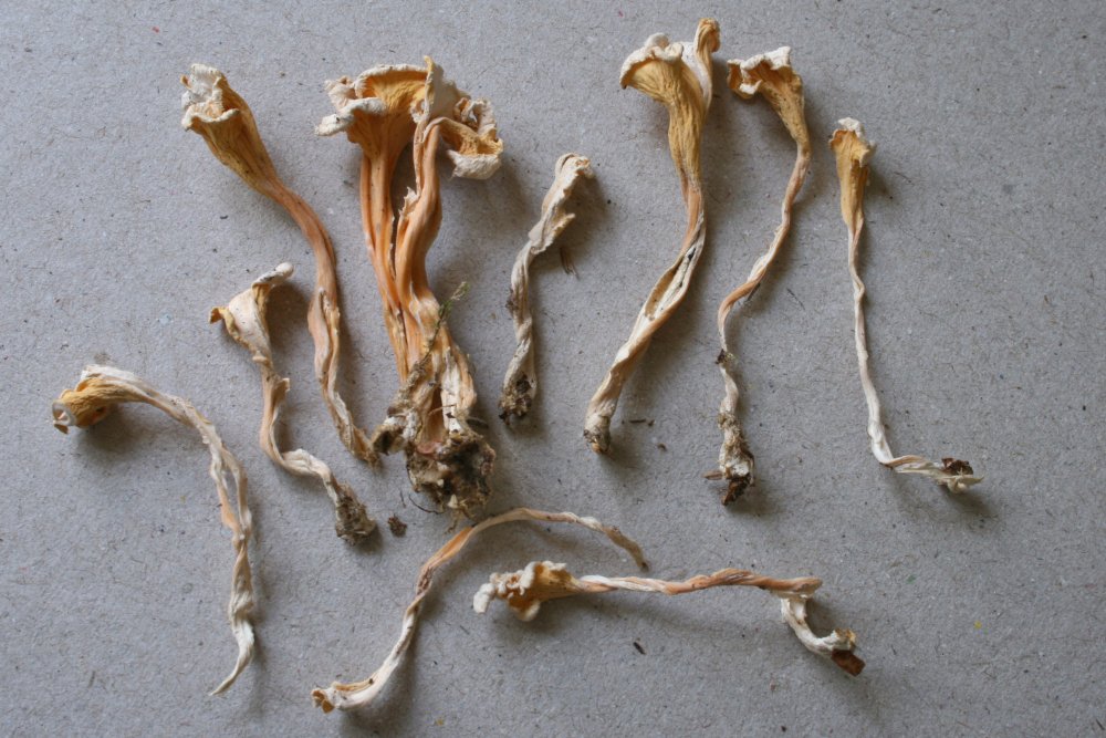Rein prinzipiell denke ich auch, dass dieser Fund in die lutescens/tubaeformis-Ecke gehört, vom flachen Hymenophor ausgehend eher zu lutescens. Aber für eine Zuordnung zu diesen gibt es m.E. zuviele Widersprüche. Noch ein Foto der Exsikkate – auch hier auffällig die weiße Innenseite!