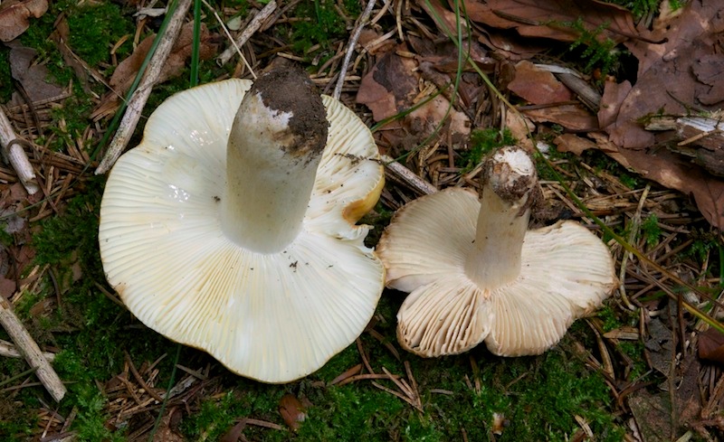 Russula ochroleuca (links) und Russula fellea (rechts)