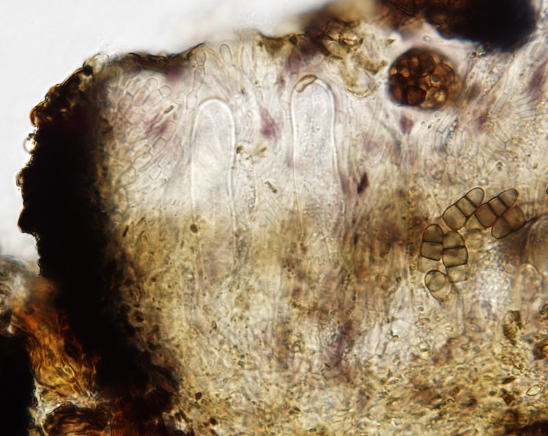 Die Sporen sind reif im Mikroskop gut durch ihre Zweifärbigkeit erkennbar (die mittleren Zellen dunkler), unreif wird es schon schwieriger. Und man muss jede dieser Aufsammlungen mikroskopieren, denn es gibt ähnliche Arten, die aber andere Mikromerkmale haben, wie z.B. Hysterographium fraxini mit mauerförmigen Sporen.