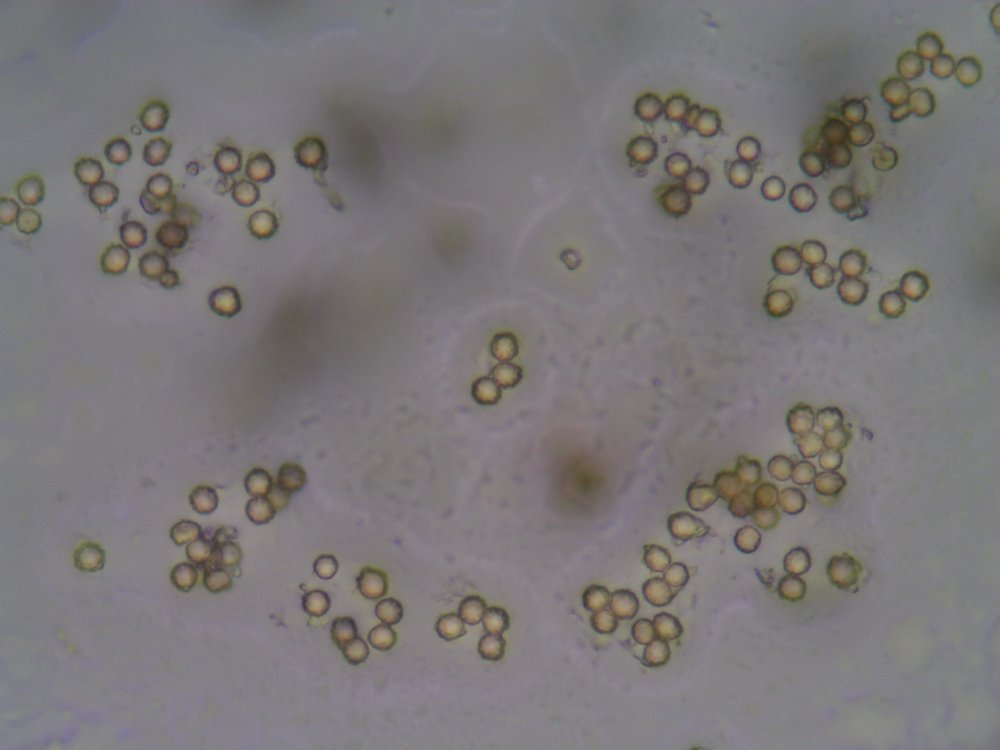 Hier vermute ich aufgrund der Häufigkeit und Sporengröße (ca. 4 µm) T.brumale. Kopf= 0,5 cm, Stiel=2,5-3,0 cm