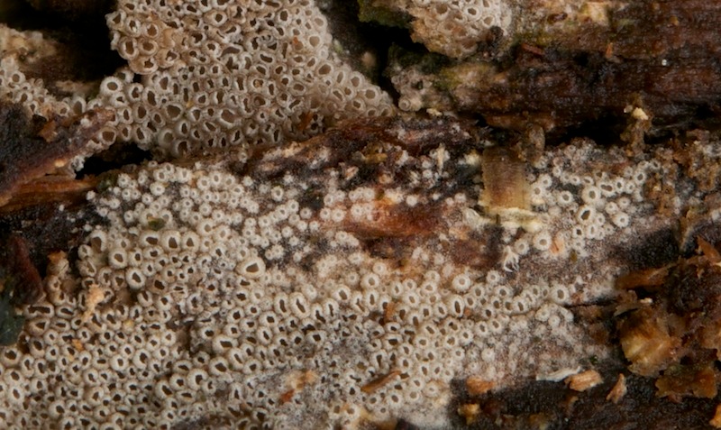 Vermutlich Trichoderma rogersonii auf liegendem Fagus-Ast, ein sehr hübscher Pustelpilz.
