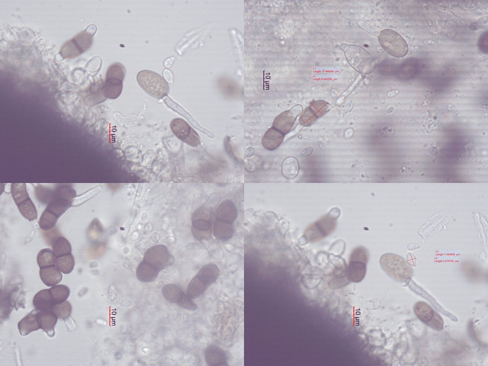 Ich habe 30 Ascosporen vermessen, mit Werten von (14) 15-18 (18,5) x 7,5 - 9 (10) my. Die meisten 16 x 8 my. Es gibt auch Ausreißer nach oben, die habe ich nicht hineingerechnet. Die Sporen sind fein warzig, mit doppelter medianer Septe. Viele reife Sporen sind zumindest an einem Ende etwas abgeflacht, was mich dazu verleitet hat, sie als Konidien zu betrachten.