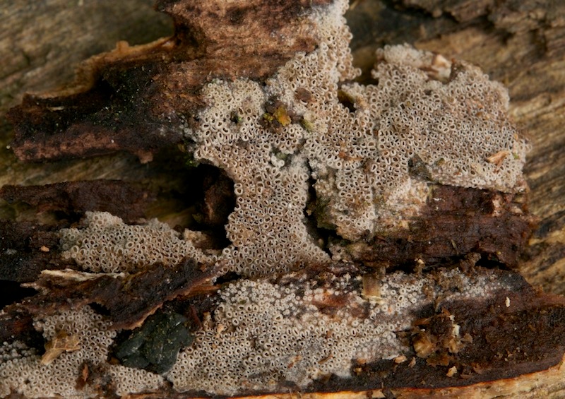 Resupinatus poriaeformis auf der Unterseite eines dicken, morschen, liegenden Fagus-Astes:
